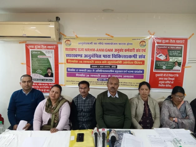 झारखंड अनुबंधित पारा चिकित्साकर्मी संघ एवं एएनएम, जी एन एम संघ के संयुक्त बैनर तले स्वास्थ्य विभाग के अनुबंध कर्मी फार्मासिस्ट, एक्सरे टेक्नीशियन, एएनएम, जीएनएम, लैब टेक्नीशियन 16 जनवरी को मुख्यमंत्री आवास का घेराव करेंगे। कर्मियों का कहना है कि वर्तमान सरकार ने 3 महीने में अनुबंध कर्मियों के समायोजन का वादा किया था। लेकिन 3 साल बीत जाने के बाद भी सरकार की ओर से कोई पहल नहीं की गई है। अब हमलोग अनशन से पहले घेराव करेंगे। इसके बाद लगभग 8000 अनुबंध कर्मी अनिश्चितकालीन हड़ताल पर चले जाएंगे। ऐसे में मरीजों को होने वाली परेशानी के लिए सरकार पूरी तरह से जिम्मेवार होगी। साथ ही उन्होंने कहा कि इस बार लड़ाई आर-पार की होगी, आश्वासन से काम नहीं चलेगा।